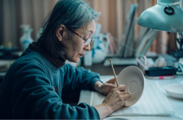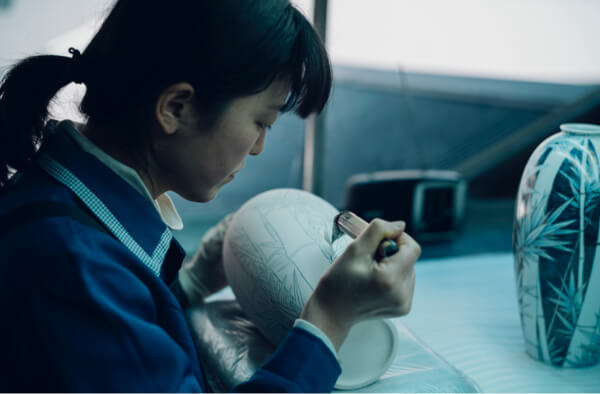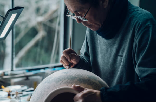 深川製磁ならではの澄み切った青色をつくり出すのは、コバルトなどの鉱物から調合した絵付け顔料「呉須」。この一色で微細な陰影、濃淡まで表現することを可能にしているのは、職人の経験と技。ときには何本もの筆を使い分けながら、繊細な筆使いで器に生命を与えてゆきます。この染付の工程を担う職人をはじめ、深川製磁には7人の伝統工芸士が在籍しています。