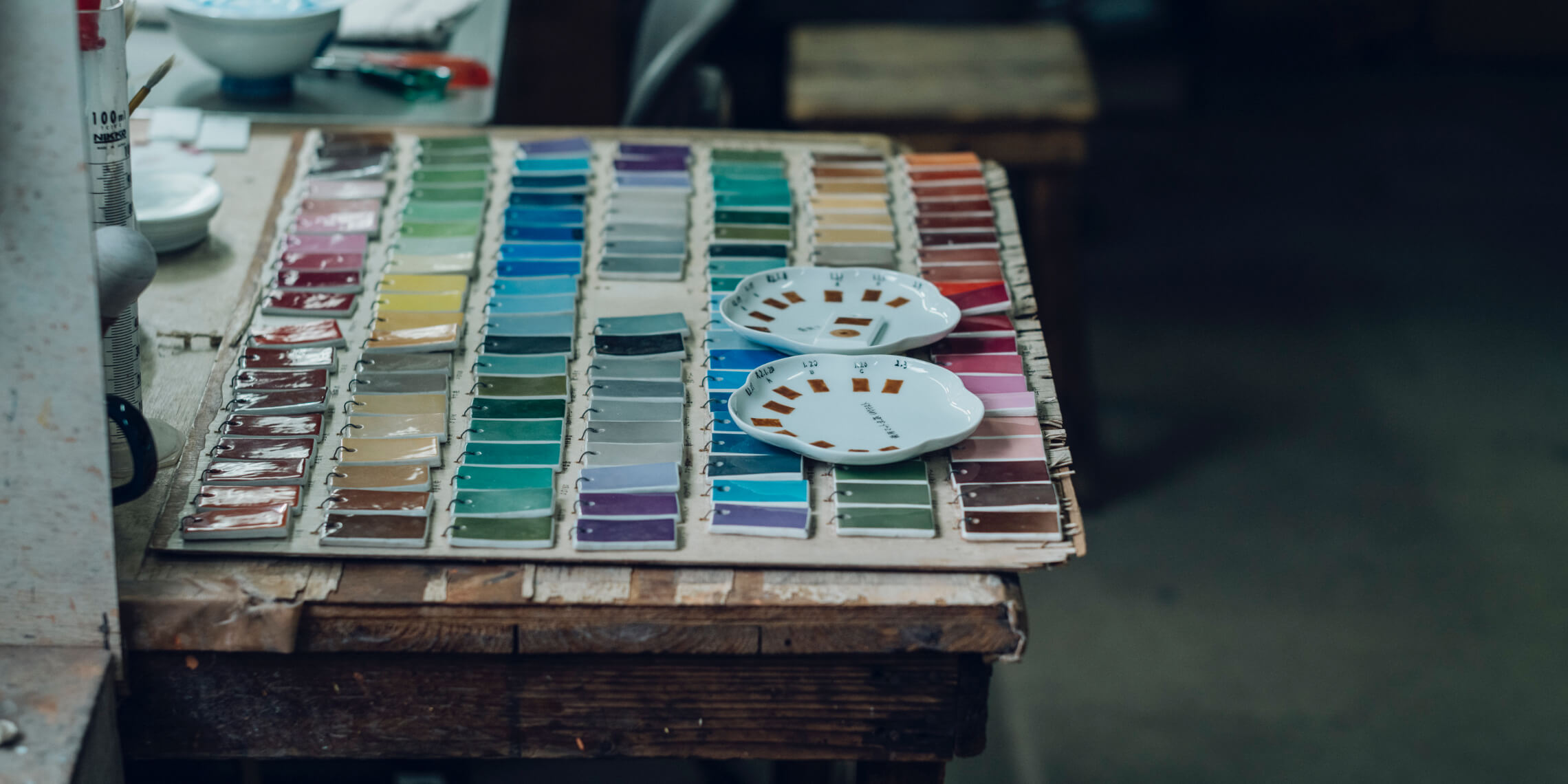 絵付けに使われる絵の具には約600種類の色があり、そのほとんどが自家調合の深川オリジナルです。絵の具の調合には専門の職人がおり、毎日異なる気温や湿度によって微妙な調節をほどこしています。