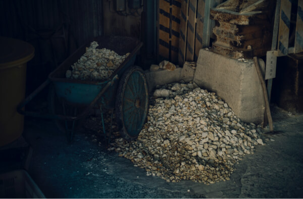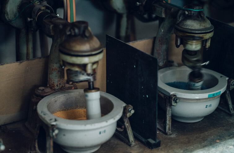 深川製磁の工房では、粘土を精製するところから磁器づくりが始まります。原料として深川製磁が使用しているのは、熊本県天草地方で採れる上質な陶石。ハンマーやミルを使ってこれを微細に砕き、水分を抜きながら練り上げて、粘土をつくります。