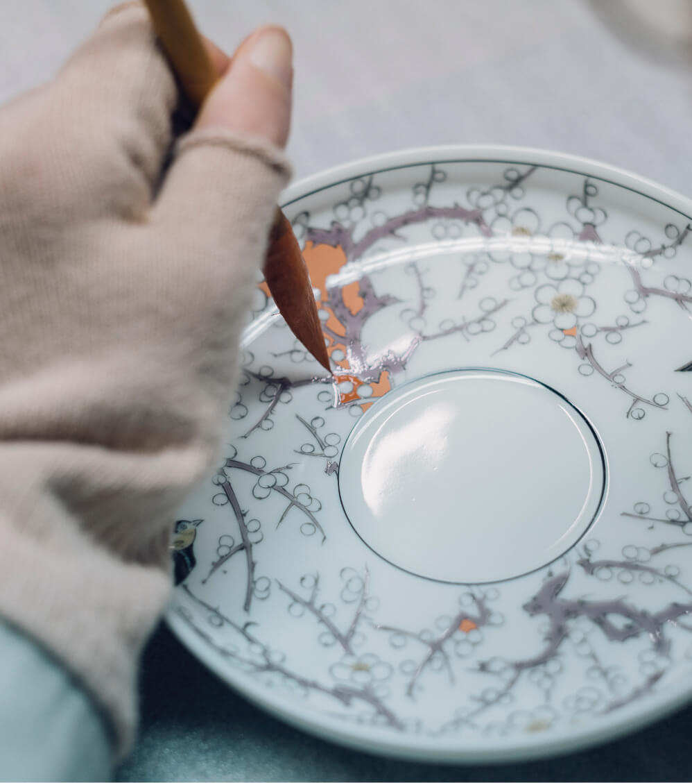 初代・忠次が西洋と日本のエッセンスを巧みに織り交ぜてつくり上げた独自のデザインは、現在も職人の手による再解釈を重ねながら継承され続けています。上絵付けでは赤や黒、黄、緑などのほか、金や銀の色絵の具を用いて絵柄を描いてゆきます。
