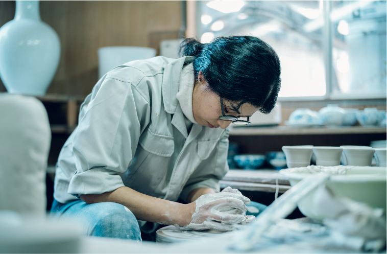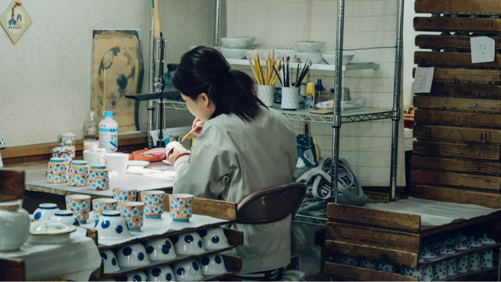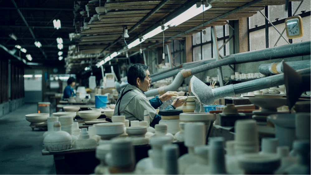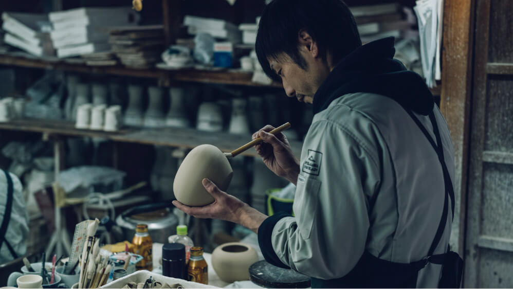 深川製磁は創業以来、生地づくりから絵の具の調合に至るまで、磁器の完成に必要なすべての工程を自社で一貫して行う稀有なものづくりを継承しています。造形、文様、彩色、あらゆる要素を自在に組み合わせられるがゆえに、作品ごとに深いデザイン表現が可能です。ひとつでも失敗があれば後戻りが効かない緊張感のなかで、各工程を担当する職人たちが技を結集し、一体となって作品をつくり上げます。