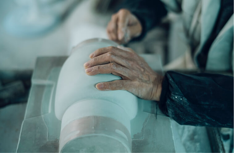 成型したあとは、余分な箇所を削りながら、さらに細かく形を調整。この工程では「1mmの4分の1」の微細なレベルまで感覚的に判断できる熟練した職人の手により、絶妙な角度やカーブに至るまで魂の込もった、美しい造形がつくり上げられます。