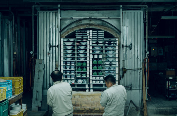 深川製磁では、一般的な磁器の焼成温度よりも50〜100℃ほど高温となる約1350℃で焼き上げます。わずか50℃の違いでも、磁器はより液体に近い不安定な状態となるため、リスクと難易度はぐっと上がります。13〜14時間にもわたる焼成中は、職人が絶えず火の色を見ながら、最適な温度と窯内の環境を保ちます。