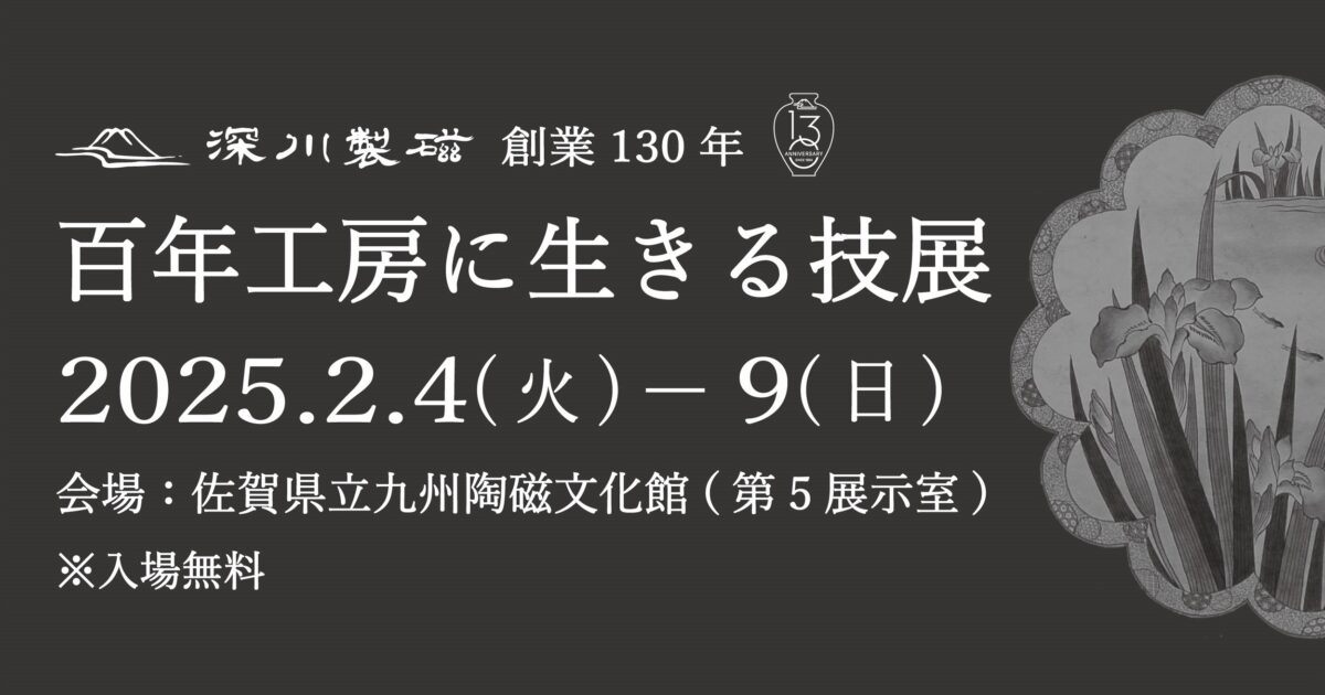 有田焼窯元 深川製磁は、創業130年を記念して、佐賀県立九州陶磁文化館にて「百年工房に生きる技展」を開催いたします。明治期、創業者深川忠次のパリ万国博覧会をはじめとした世界への挑戦を、当時の明治意匠図(デザイン画)や古陶磁器を中心に展示。明治期から続く、粘土精製から上絵付まで一貫生産の工房で代々職人に継承されてきた独自の手法を、窯道具や職人の実演を交えてご紹介させていただきます。また技と美感を継承した現代の職人たちによる130周年特別作品も出品いたします。百年工房に脈々と息づいてきた技をゆっくりとご堪能ください。